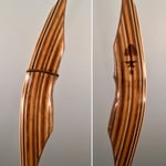 This beautiful recurve hybrid is 58” nock to nock and draws 43# at 30”. The bow is made from barn find walnut and maple, a burl saved from a burn pile, and curly maple from a scrap pile!