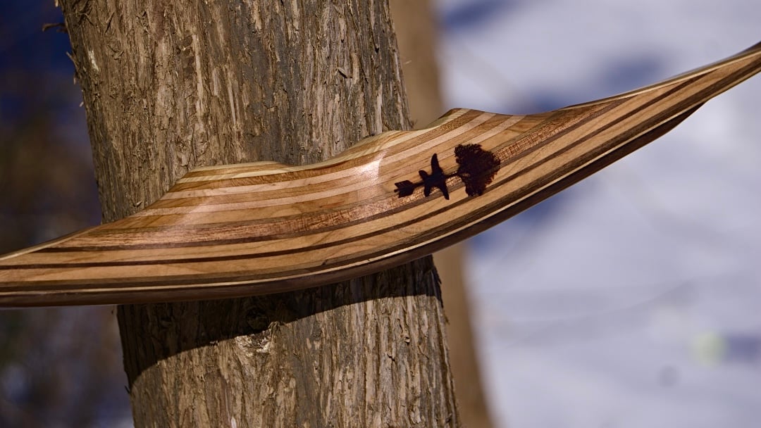 What a beautiful bow. Curly birch limbs with a recycled walnut core. The riser is comprised of reclaimed walnut, cherry, ash, and ipe. This bow is very fast, very quiet, and designed for 28-29” draw lengths.